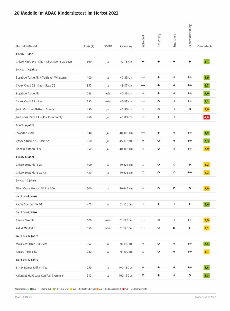 Der ADAC hat 20 Kindersitze in allen Größen auf Sicherheit, Bedienung, Ergonomie und Schadstoffgehalt getestet. Das Ergebnis: Elf der untersuchten Sitze erreichen das ADAC Urteil „gut“, acht Modelle erhalten ein „befriedigend“. Wegen zu hoher Schadstoffbelastung wird ein Sitz als „mangelhaft“ eingestuft und fällt durch.