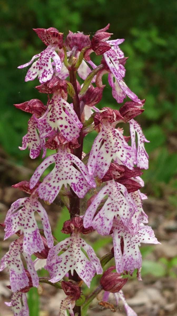 Das Purpur-Knabenkraut wies 2021 mit 218 und 2022 mit 259 Pflanzen den größten Orchideenstand auf dem entbuschten Magerasen am Mönchshang auf. Mit bis zu 80cm Höhe zählt dieses hübsche und reichblütige Knabenkrautgewächs zu den größten heimischen Orchideenarten. Zudem konnte aktuell das bei uns deutlich seltenere Helm-Knabenkraut (Orchis militaris) auf dem ehemaligen Weinbergshang mit drei Exemplaren nachgewiesen werden.
