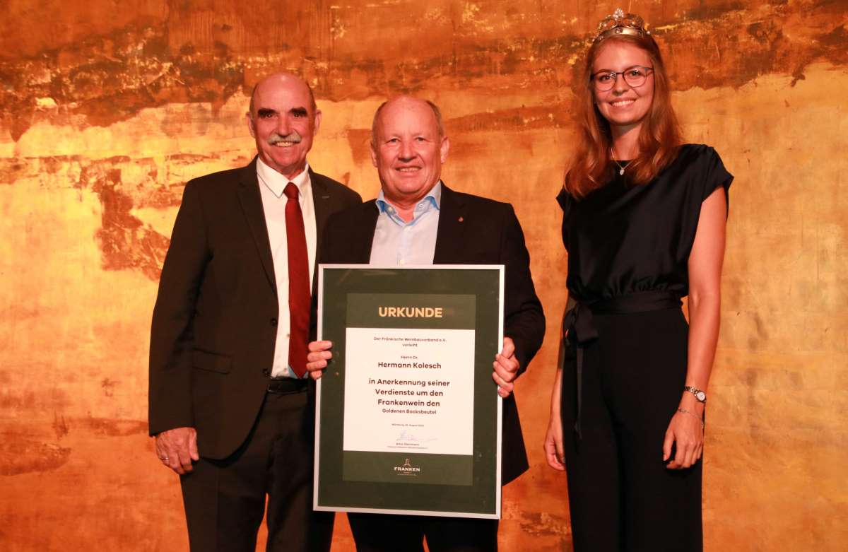 Mit dem Goldenen Bocksbeutel erhielt Dr. Hermann Kolesch die höchste Auszeichnung der berufsständischen Vertretung der fränkischen Winzerinnen und Winzer. Der ehemalige Präsident der Bayerischen Landesanstalt für Weinbau und Gartenbau (LWG) in Veitshöchheim habe während seiner Laufbahn an zahlreichen Stellen die fränkische Weinwirtschaft neu aufgestellt und bereichert, sagte Weinbaupräsident Artur Steinmann in seiner Laudatio. Der gelernte Winzer und promovierte Diplom-Agraringenieur Dr. Kolesch habe als Sachgebietsleiter an der Regierung von Unterfranken und als Leiter des Teams Weinbau am Amt für Landwirtschaft und Ernährung in Kitzingen zahlreiche fränkische Weingüter bei der Sortimentsgestaltung, Vermarktung, Wirtschaftlichkeit und Erbfolge als Unternehmensberater unterstützt und trieb den Bau moderner Vinotheken voran. Als Präsident der LWG war er frühzeitig bei den Themen Biodiversität und Nachhaltigkeit am Puls der Zeit und sah immer Weinbau, Tourismus, Forschung und Lehre als Gesamtkonzept. Dr. Kolesch gilt als Motor des Weintourismuskonzepts „Franken – Wein.Schöner.Land!“ und gab mit den terroir f Punkten der gesamten Weinbauregion Impulse. Auch nach seinem Ruhestand setzt sich Dr. Kolesch verdienstvoll und engagiert weiter für den fränkischen Weinbau ein. „Sie haben sich ganz in außerordentlicher Weise für den Frankenwein und die Weinbauregion Franken eingesetzt und mit ihrer Arbeit nicht nur Franken bereichert, sondern mit Ihrer Leidenschaft auch ganz viele Menschen für den Frankenwein begeistert“, lobte Weinbaupräsident Steinmann bei der Überreichung der Auszeichnung.
