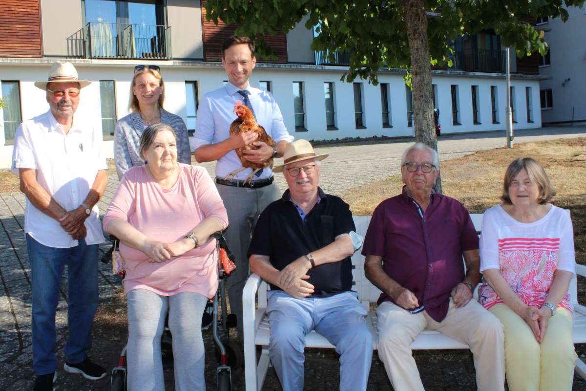 An einem sonnigen Vormittag standen die Tiere wieder einmal im Mittelpunkt. Simone Falkenstein, Geschäftsführerin im Kreisalten- und Pflegeheim Werneck, hatte einige Unterstützerinnen und Unterstützer der Aktion sowie Gäste zum artgerechten Hühner-Quartier eingeladen. Landrat Florian Töpper würdigte in einer kurzen Ansprache das Projekt als vorbildlich. Er verwies auf die therapeutische Wirkung von Tieren, schon das Beobachten von Hühnern soll positive Effekte haben. „Es ist großartig, dass Sie den Bewohnerinnen und Bewohnern so etwas ermöglichen“, lobte er den Einsatz aller Beteiligten.