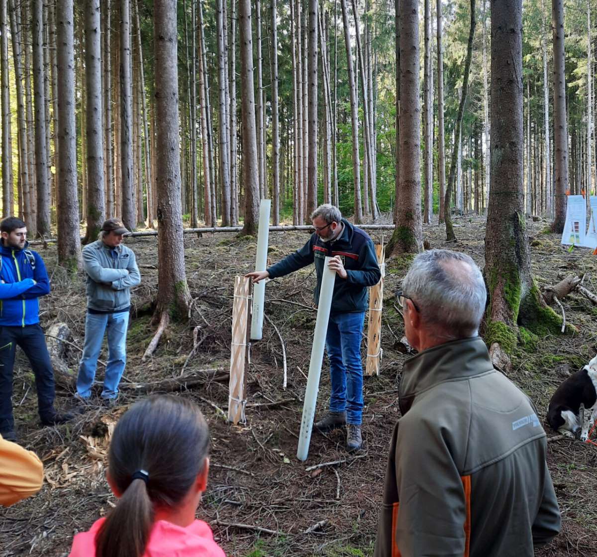 Als nächste Station ging es zu einem Gebiet, in dem gerade junge Bäume aufgeforstet werden. Dabei muss bewertet werden, welche Bäume weiter gefördert werden sollen. Diesen Bäumen wird dann Luft zum Wachsen gegeben. Dafür werden andere Bäume entnommen. In der sogenannten Qualifizierungsphase werden also die schönsten und vitalsten Bäume ausgesucht. Die Krone muss dabei gut ausgeformt sein, da sie der „Motor“ der Bäume ist. Dieser Vorgang muss spätestens alle zehn Jahre wiederholt werden.