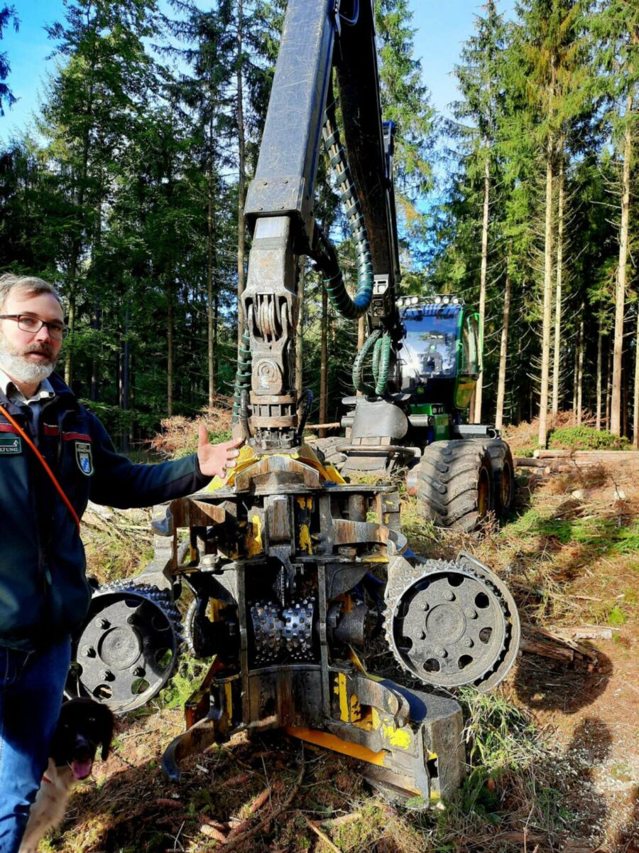 Anschließend konnte ein Harvester oder auch Holzvollernter im Einsatz beobachtet werden. Ein Harvester fällt innerhalb von Sekunden einen Baum, entastet diesen und schneidet den Stamm direkt in die gewünschte voreingestellte Länge. Allerdings kostet so eine Maschine ungefähr 550.000 Euro. Gefällt werden mussten die Bäume, da sie vom Borkenkäfer befallen waren. Der Bestand war ca. 35 bis 40 Jahre alt und hätte eigentlich noch einmal mindestens so lange stehen bleiben sollen.